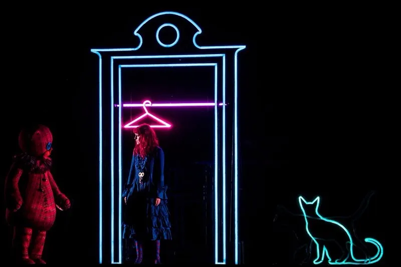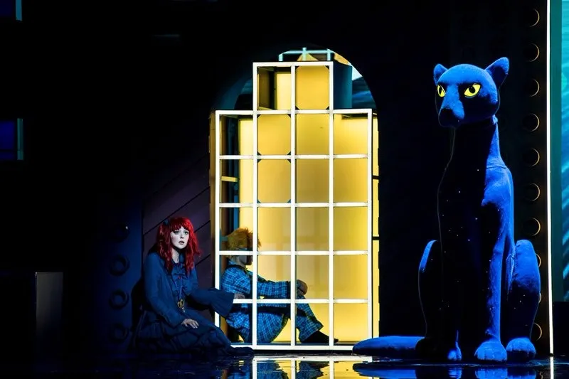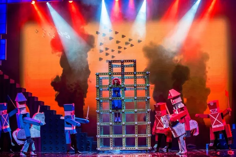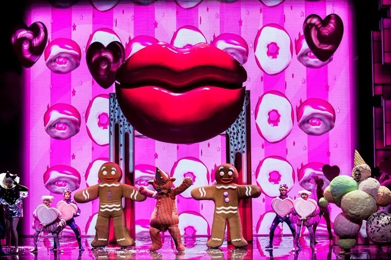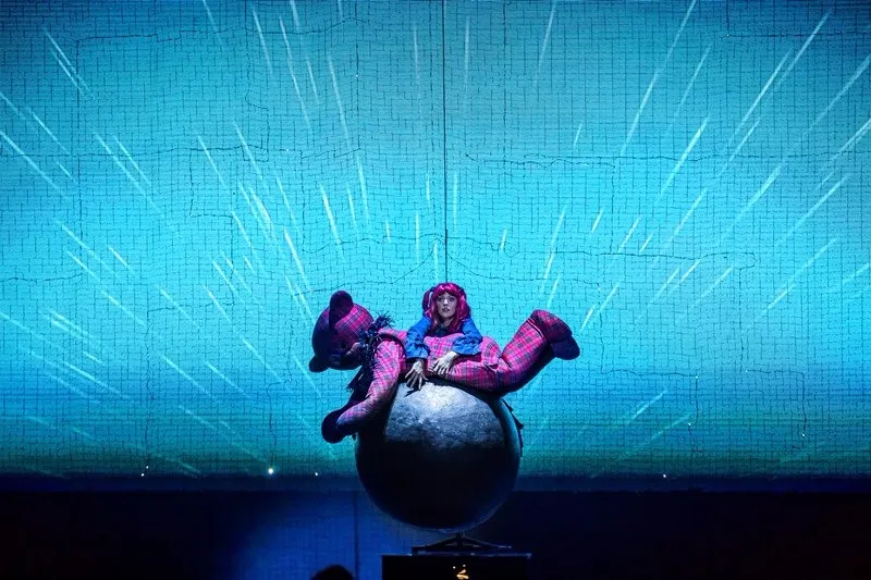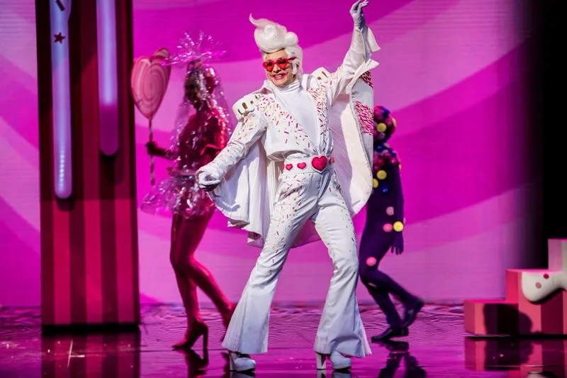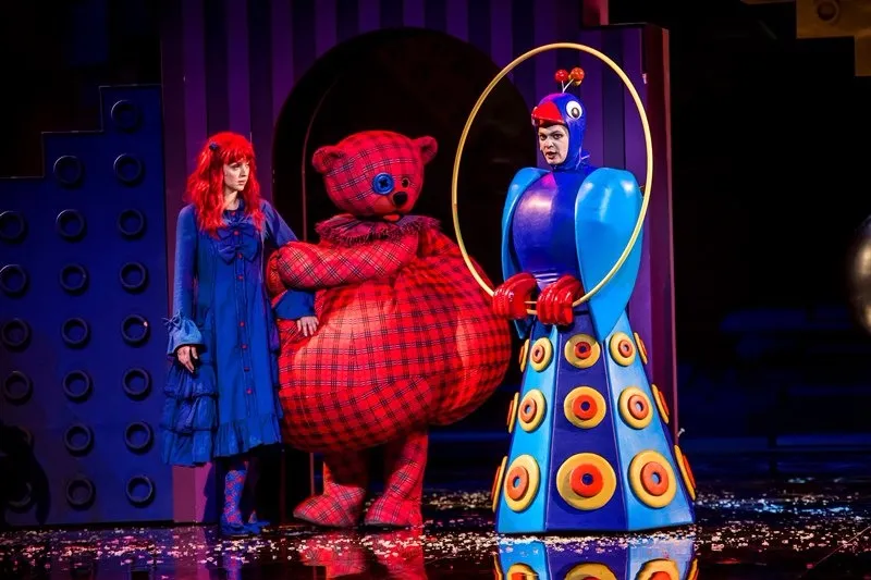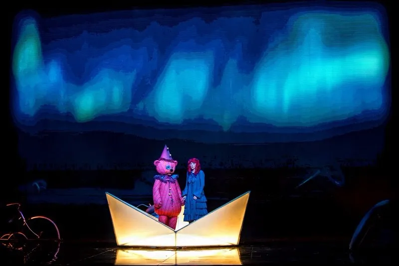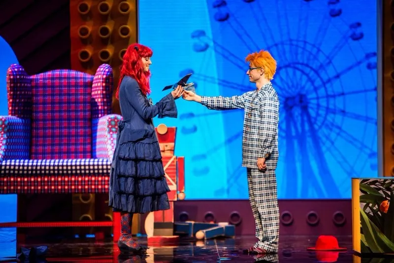 Позже, уже в самом спектакле, ощущение яркого сна-бреда поддерживается и теми же абсурдными персонажами с их харизматичными странными танцами (вообще, хореографии на мой вкус для мюзикла маловато, можно было больше), и тем, что многие герои как бы перекочевали в сон из основного сознания: Карамельный король — вылитый Элвис Пресли, доктор напоминает бертоновского безумного шляпника, Птицелов — охотника из “Джуманджи”, а гигантский медвежонок Тидель с пуговицей вместо глаза — это воплощение детского “вымышленного друга”: ожившей и ставшей большой и сильной любимой игрушки.