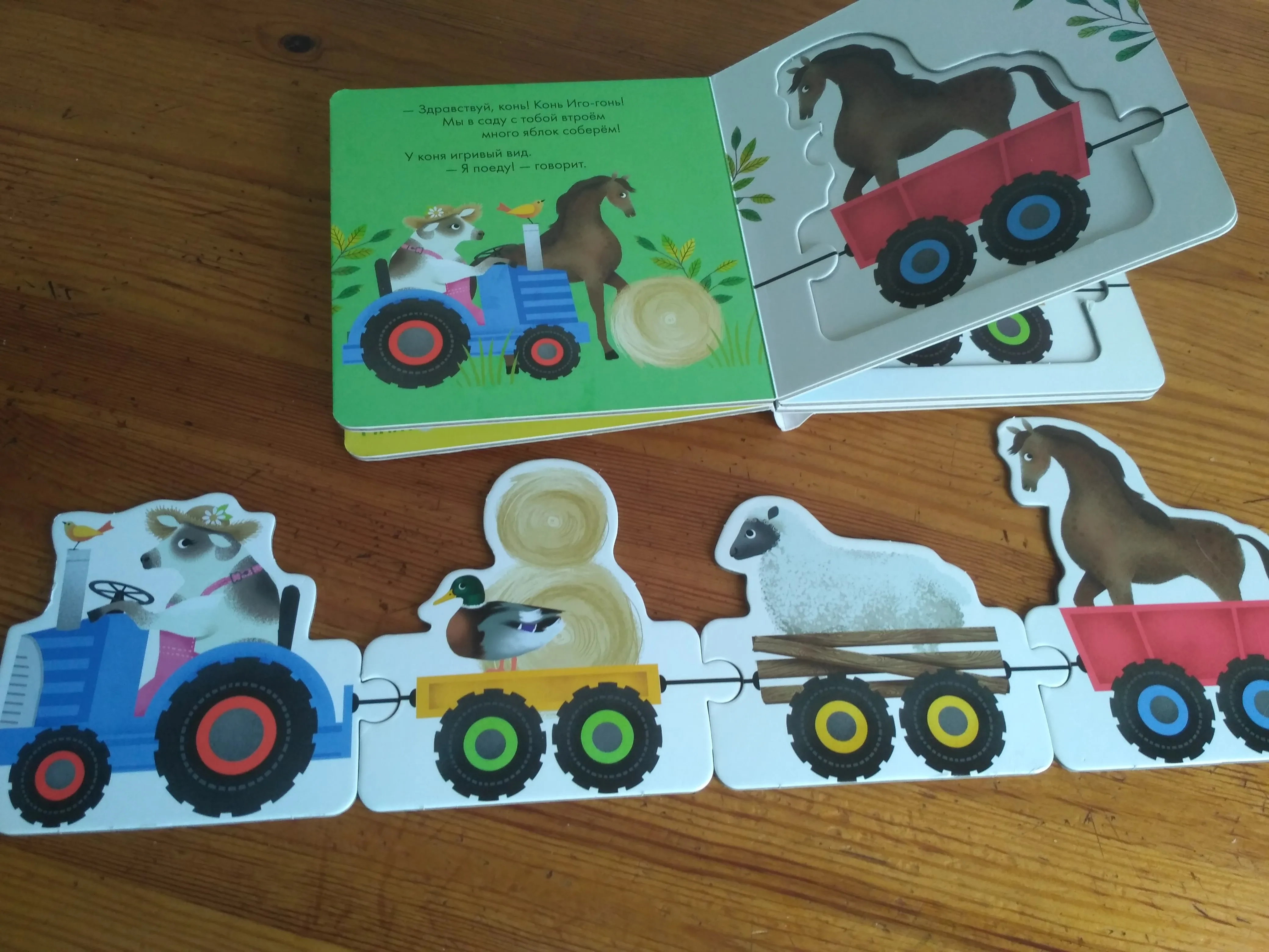 Эту книжку заказывали для самой маленькой. Очень крепкий несгибаемый и несгрызаемый картон, крупные понятные картинки, простые стишки. На каждой страничке вынимаемый персонаж, которого вместе с остальными можно легко сложить в поезд-пазл.