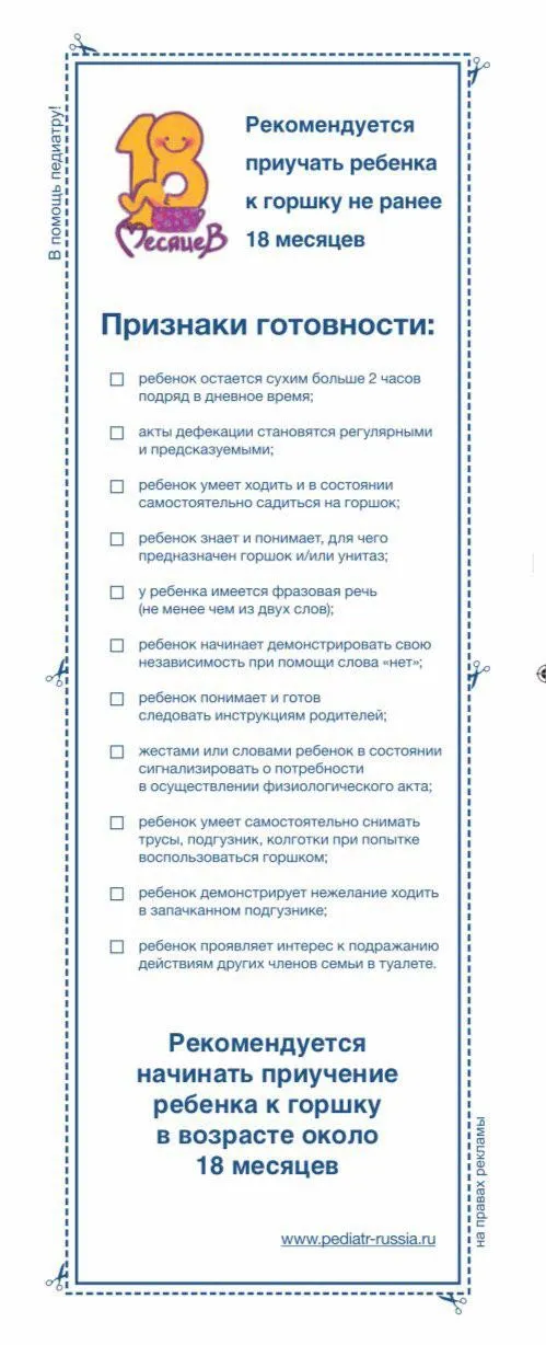 Рекомендации по приучению к горшку, данные Американской Академии педиатрии: https://cyberleninka.ru/article/v/rekomendatsii-po-priucheniyu-k-gorshku-dannye-amerikanskoy-akademii-pediatrii;
