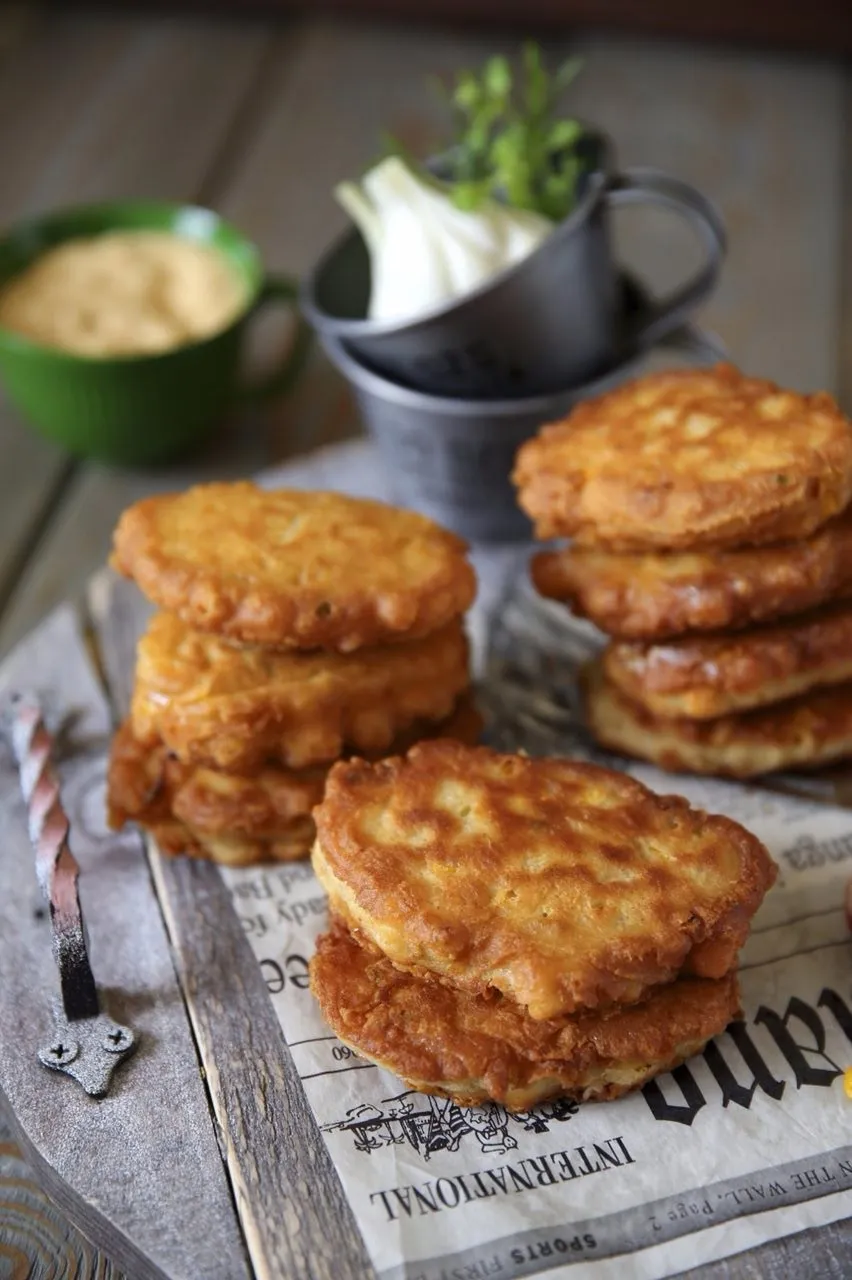 *Кукурузные оладьи прекрасно сочетаются с соусом из сметаны, чеснока и мяты. Для соусасмешай 200 г сметаны, 2-5 мелко рубленых зубчика чеснока и 5 г измельченной мяты. *